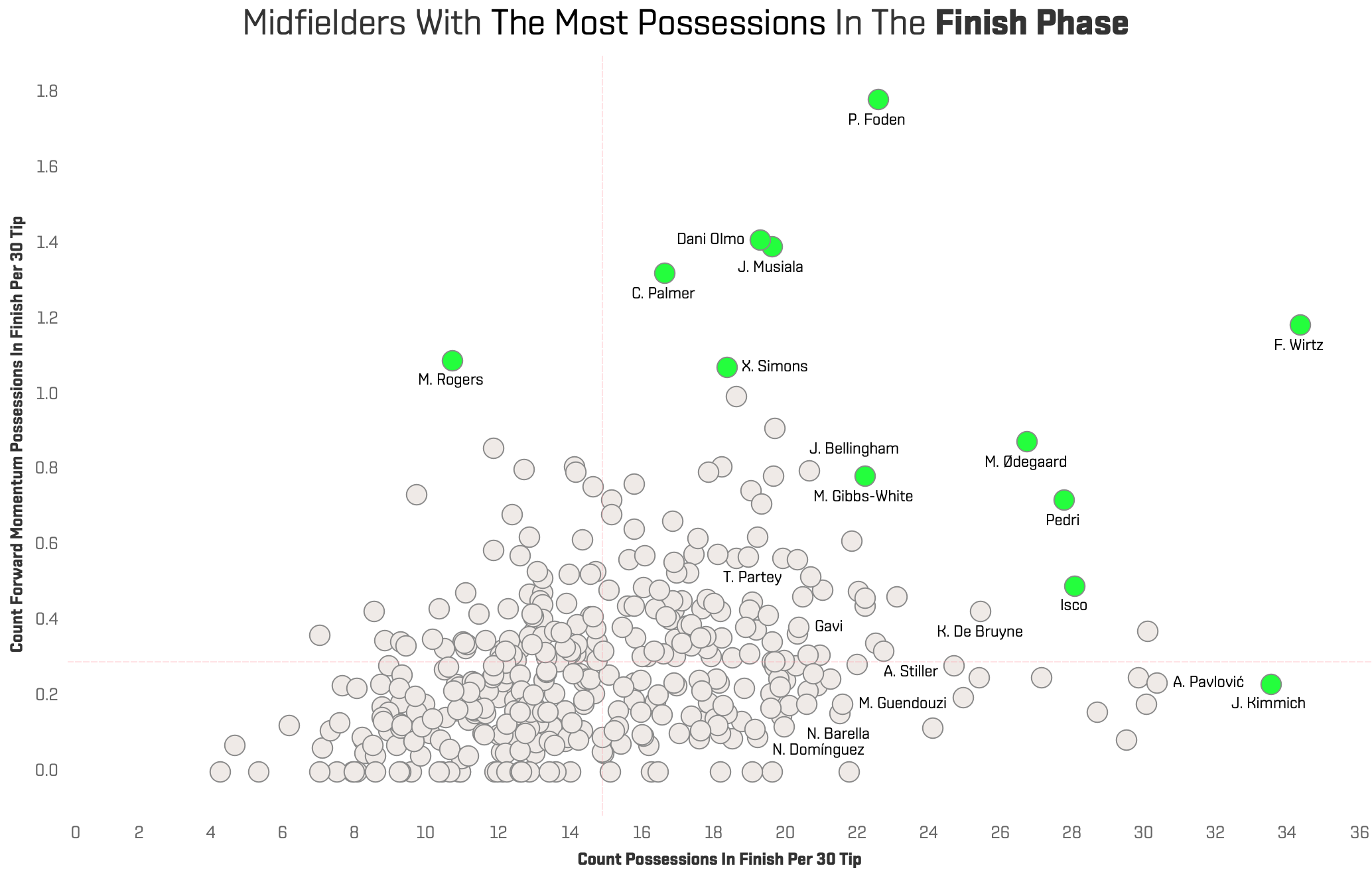 Florian Wirtz has the highest share of possessions in the Finish phase. However, Cole Palmer, Jamal Musiala, Dani Olmo and Phil Foden all averaged more than 1.3 forward momentum actions per 30 TIP. These are midfielders who consistently drive play forward in decisive moments and act as key link-up players in their teams' final-third progression.
