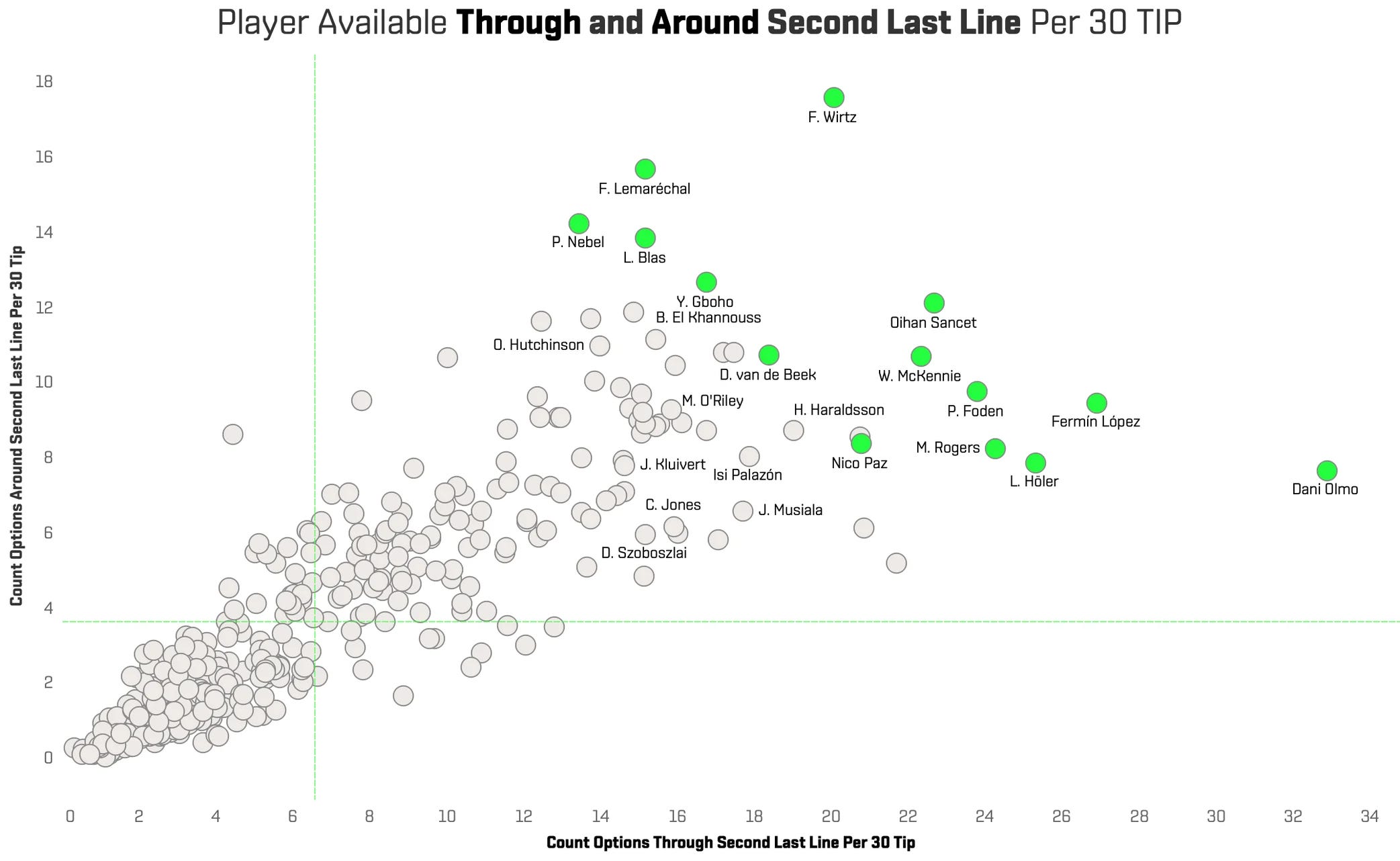 On the x-axis, we show the number of times a player is available for a pass through the opponent’s second last line. Dani Olmo ranks highest in this metric, closely followed by his teammate Fermín López. On the y-axis, we measure availability for passes around the second line, where Florian Wirtz leads the way.