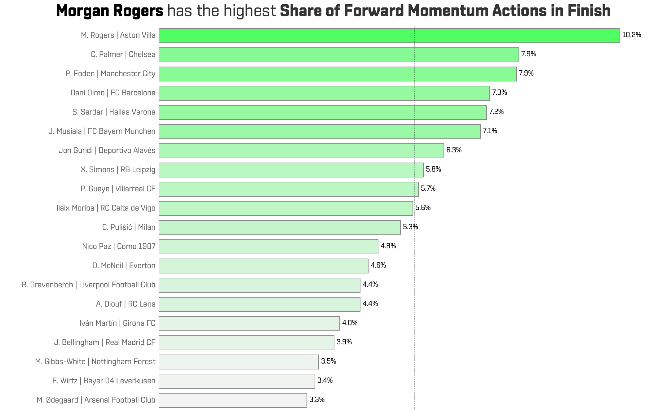 A sharp eye may have spotted Aston Villa’s Morgan Rogers in the previous chart. In the visualisation below, his impact becomes even clearer. Rogers leads all players in Forward Momentum actions as a share of total possessions: