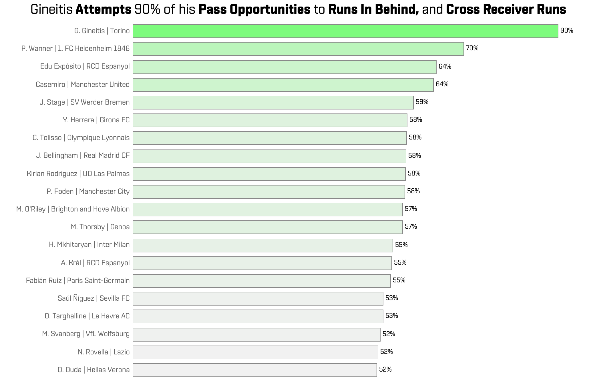 Other standouts include Rodrigo de Paul (Atletico Madrid) who ranks second for pass attempts to runs in behind, and 21-year-old Gvidas Gineitis (Torino) - the only player ranking above Wirtz in pass attempts to cross-receivers.