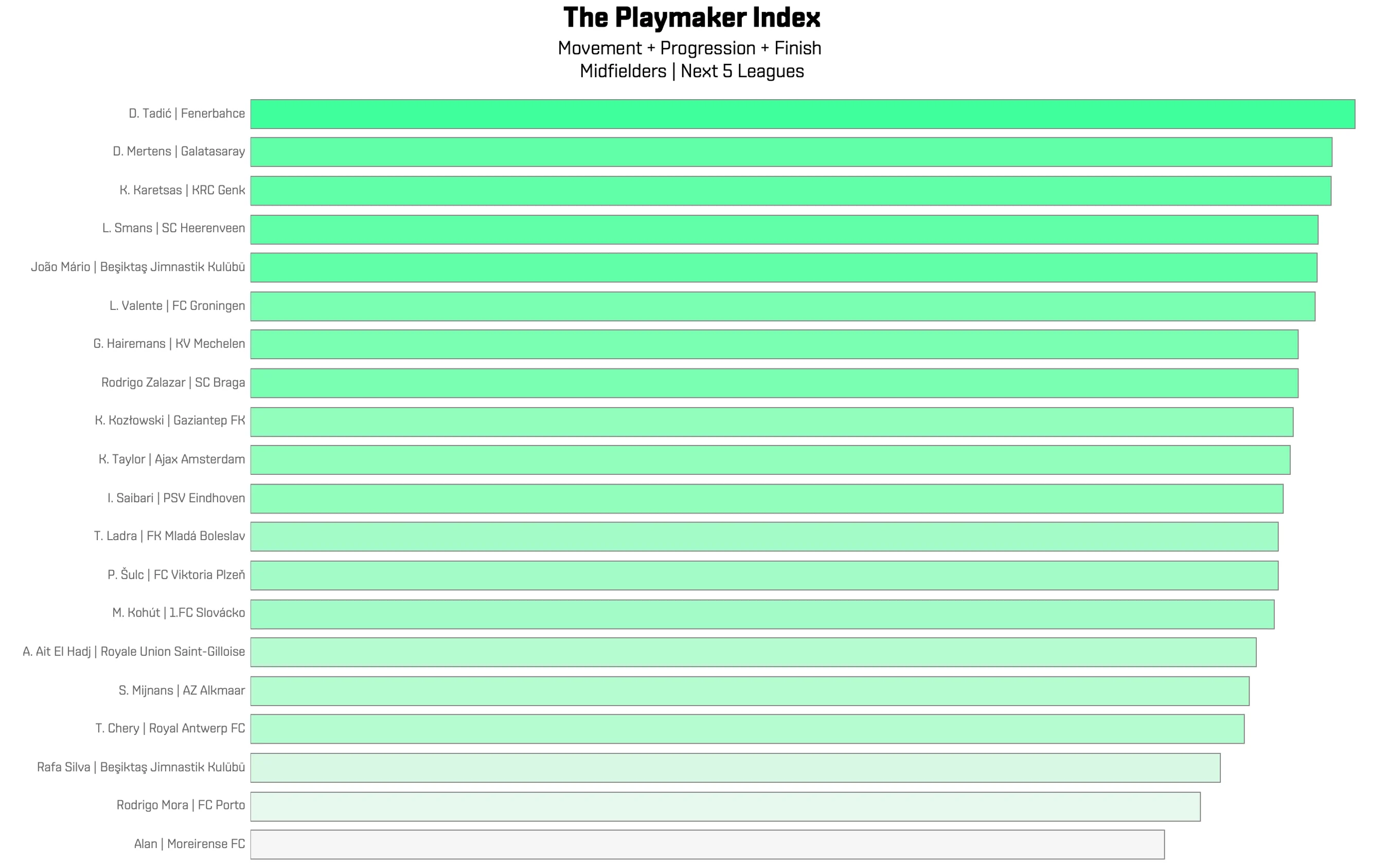 Below, we highlight top-performing midfielders from the “Next Five” leagues: the Eredivisie, Belgian Pro League, Primeira Liga, Turkey’s Süper Lig, and the Czech First League: