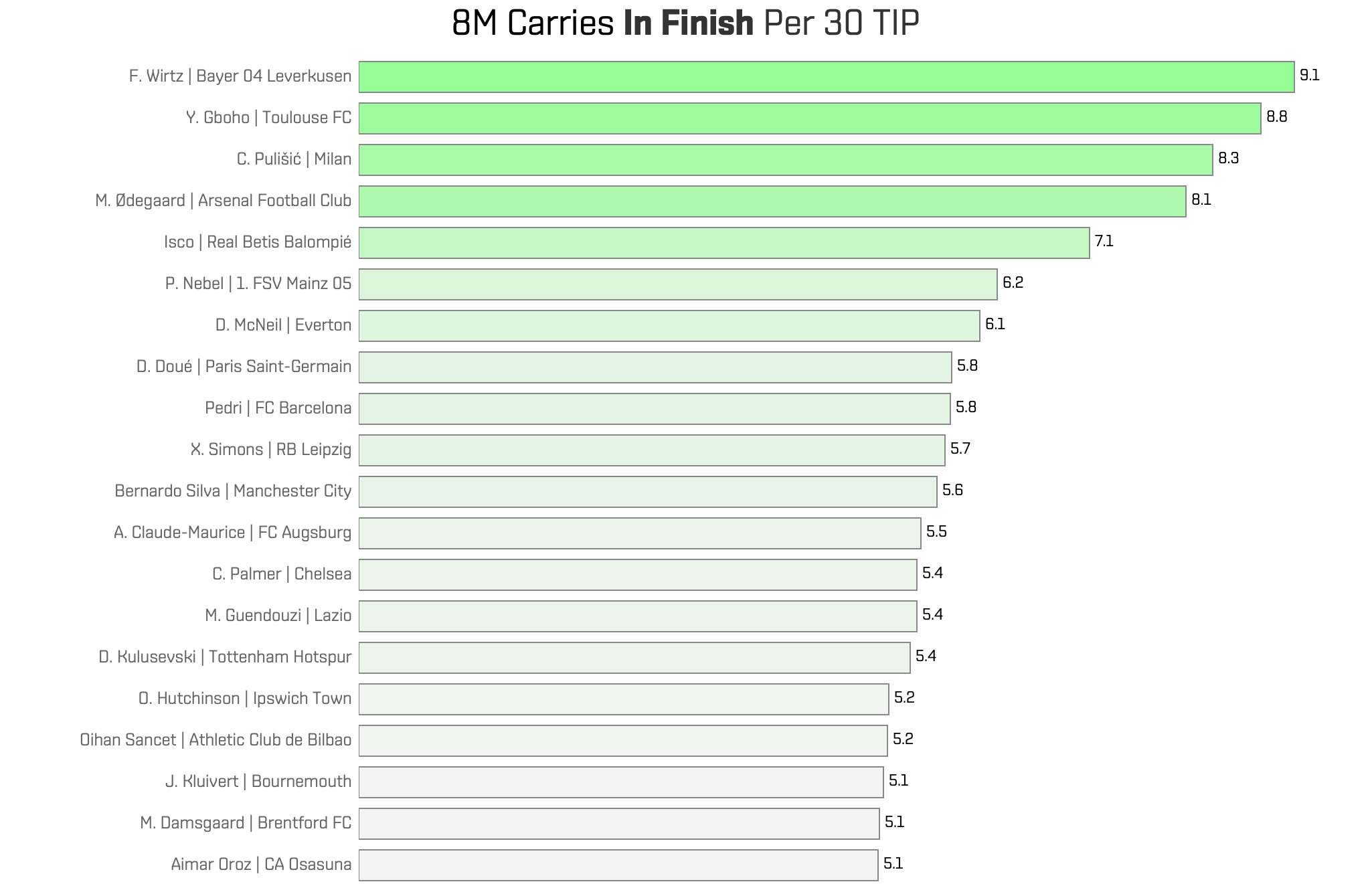 In this bar chart, we rank midfielders based on the number of carries covering at least 8 meters. Florian Wirtz ranks first with an average of 9 carries per game, and he’s in strong company alongside other well-known attacking midfielders such as Martin Ødegaard and Isco. There are also some less high-profile names at the top of the list: Yann Gboho (Toulouse), Dwight McNeil (Everton) and Paul Nebel (Mainz 05).