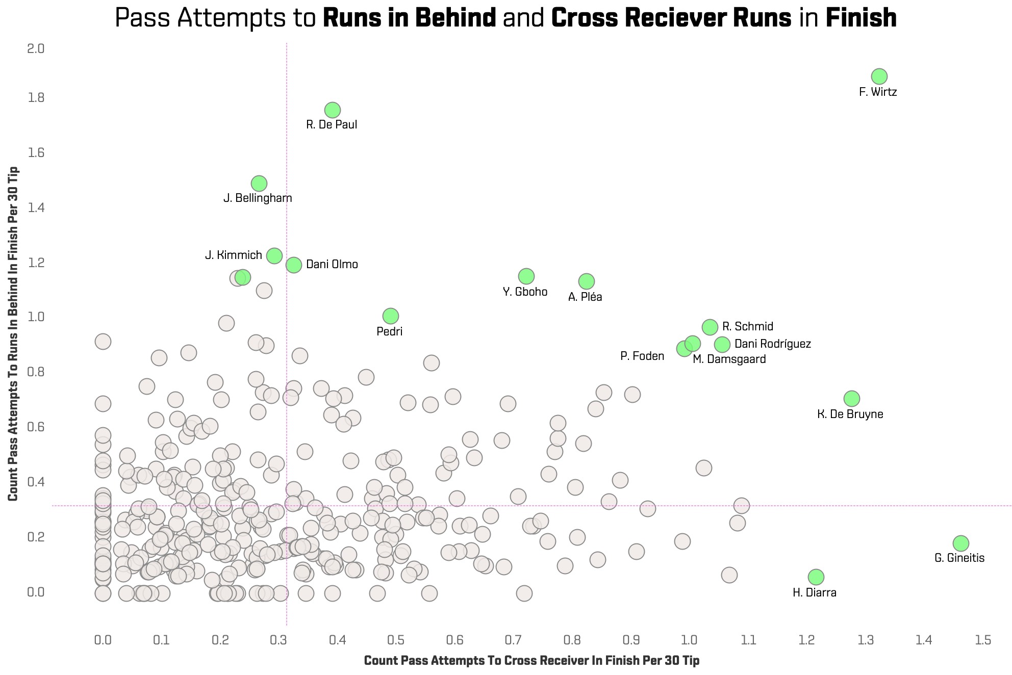 In the scatter plot below, we show how often midfielders attempt passes to runs in behind (x-axis) and to cross receiver runs (y-axis) during the Finish phase: