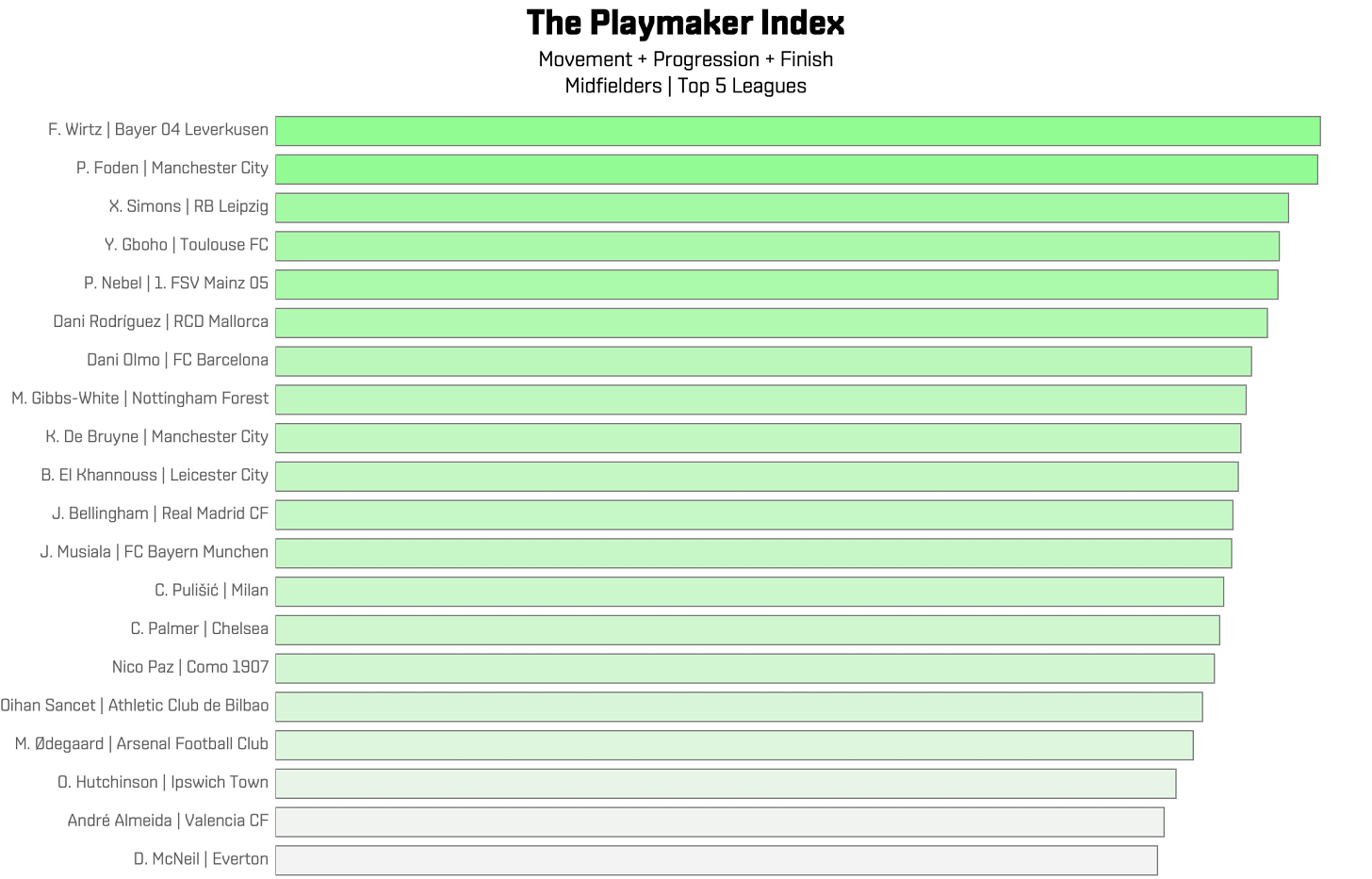 Florian Wirtz tops the Playmaker Index, narrowly edging out Phil Foden and Xavi Simons. What sets Wirtz apart is his consistency as he ranks among the top two across all key requirements.
