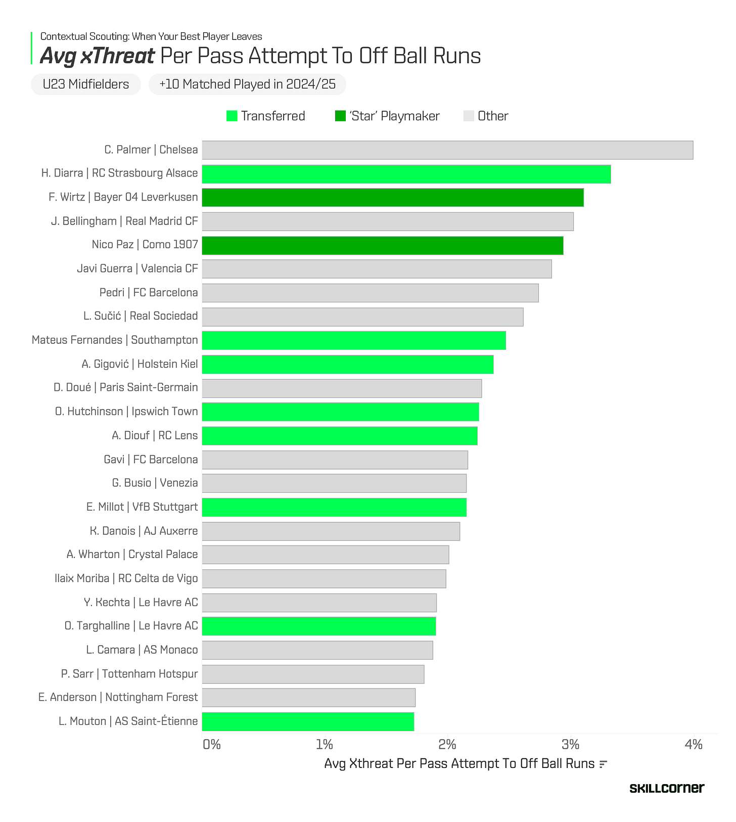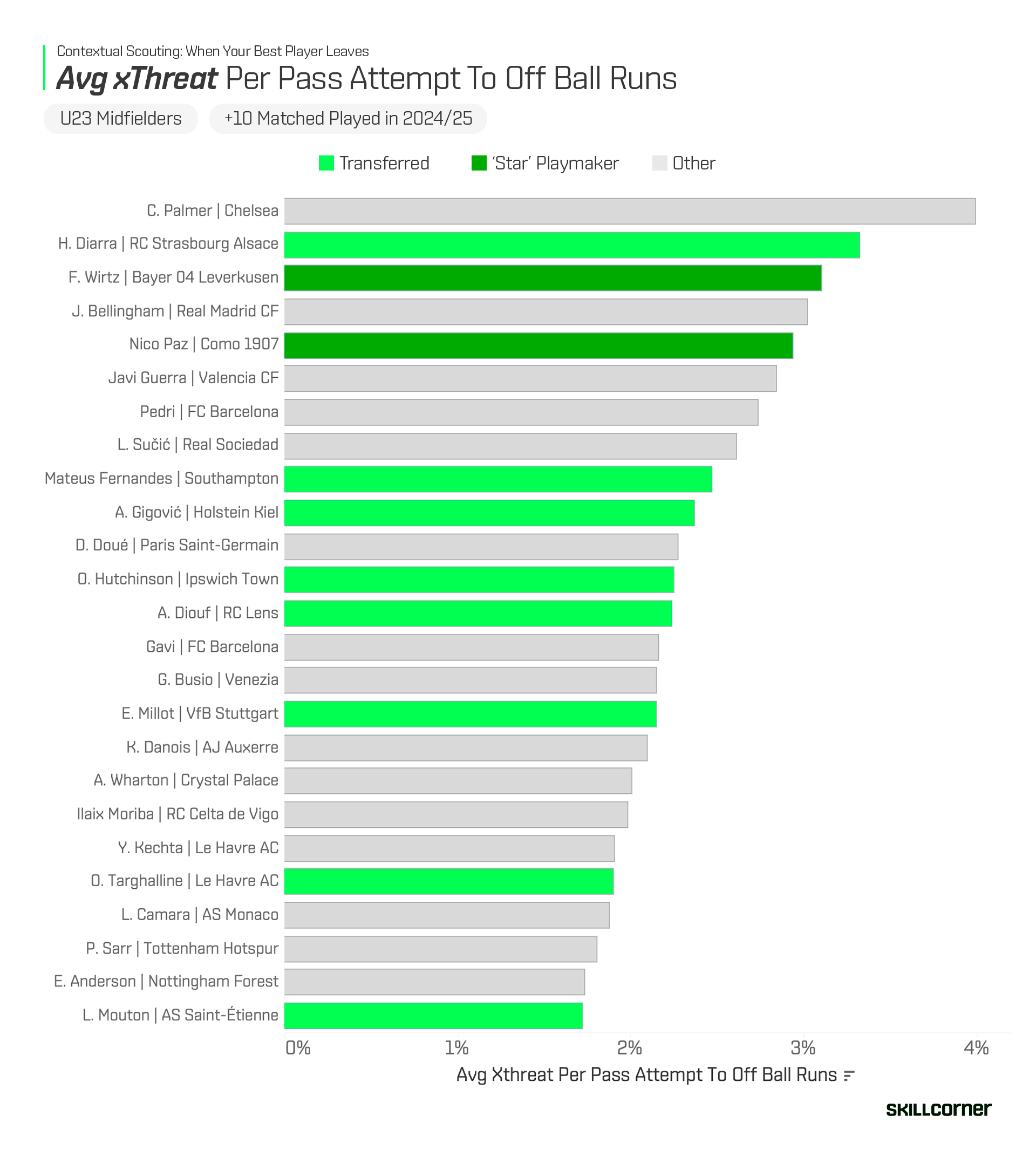 At the top of the ranking we find Cole Palmer, averaging 4 per cent threat per pass attempt to off ball runs. In practical terms, this implies that if 100 passes were completed, around 4 would be expected to result in a goal within ten seconds. In terms of pass selection, Palmer averaged 2.1 pass attempts to runs in behind (85th percentile) and 1.1 pass attempts to cross receivers (89th percentile) in the English Premier League.