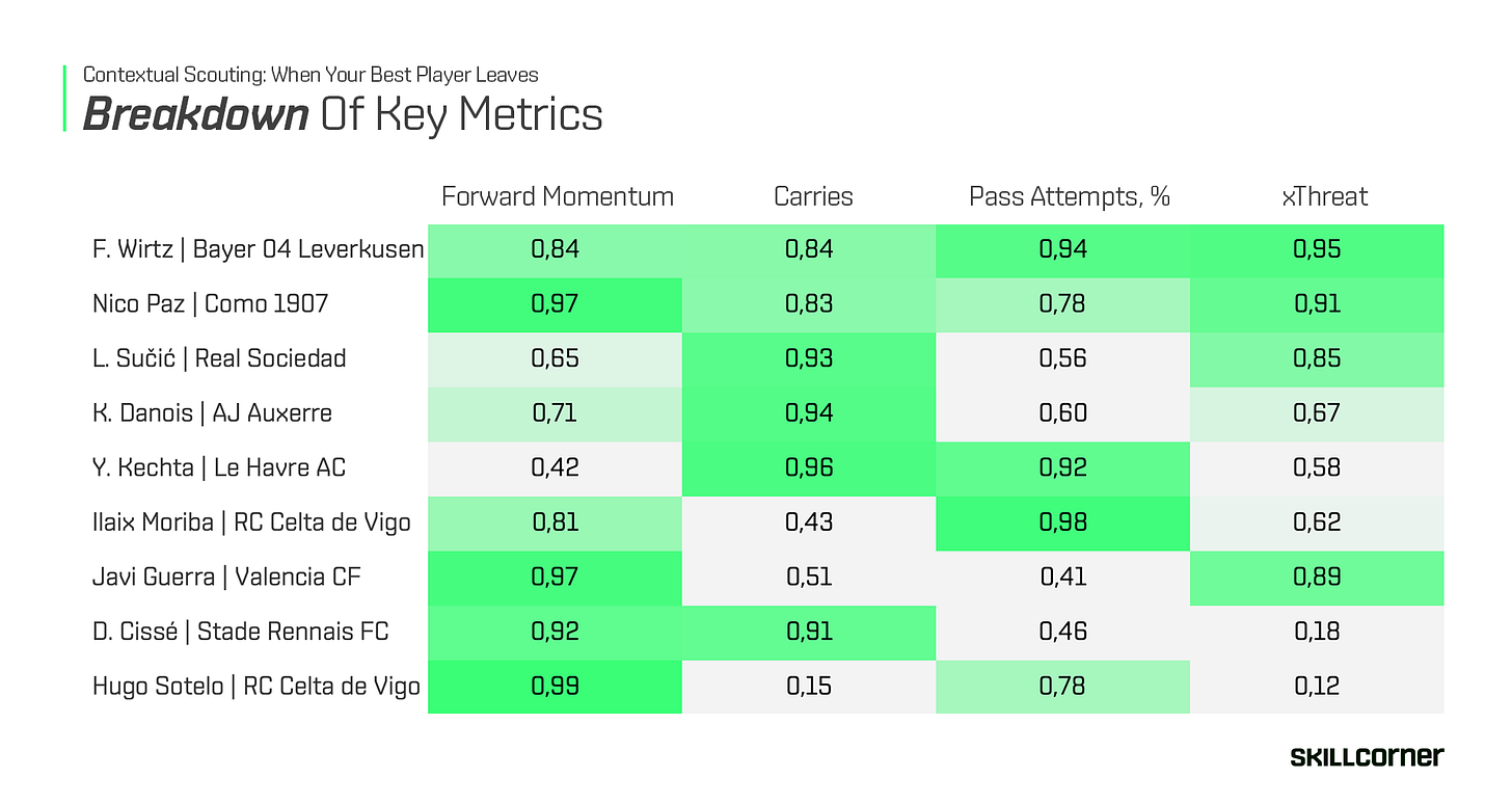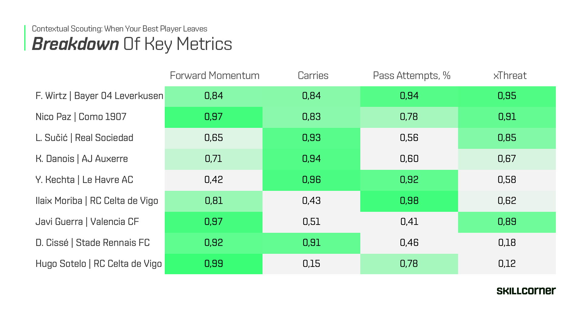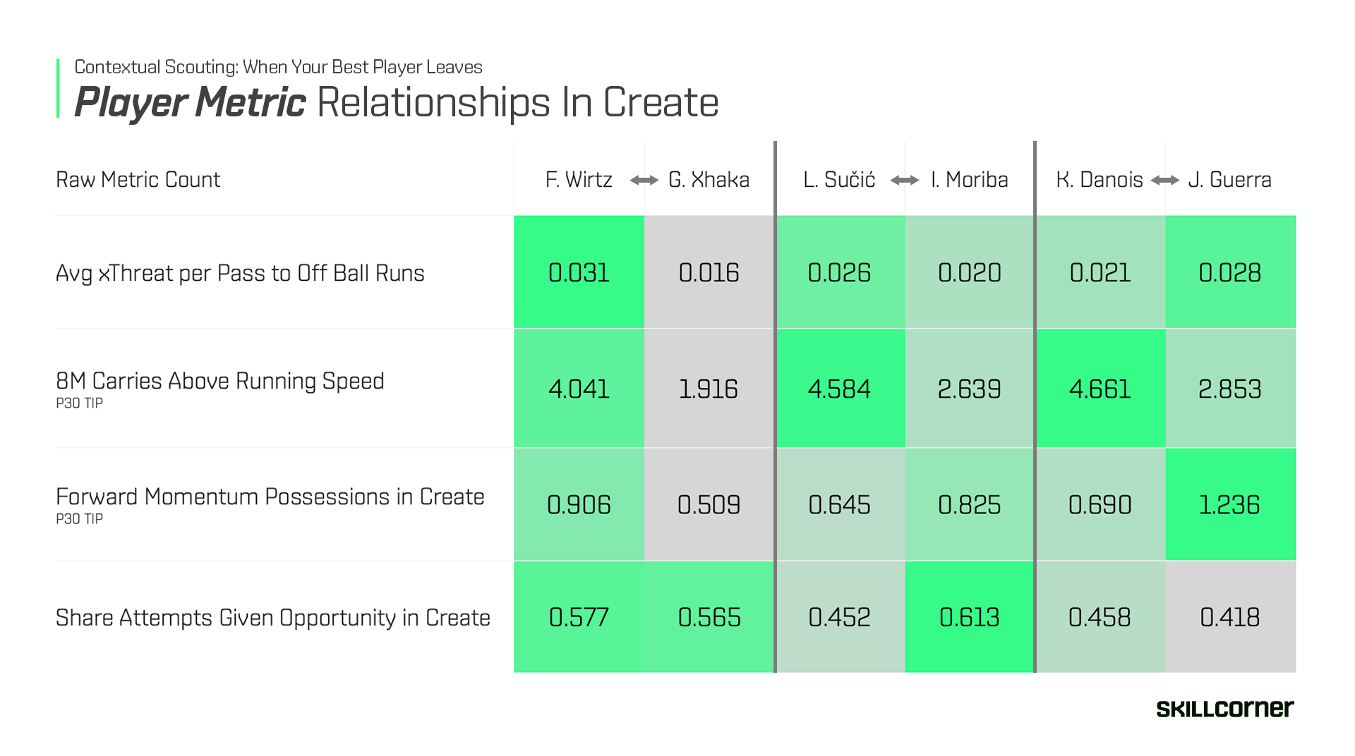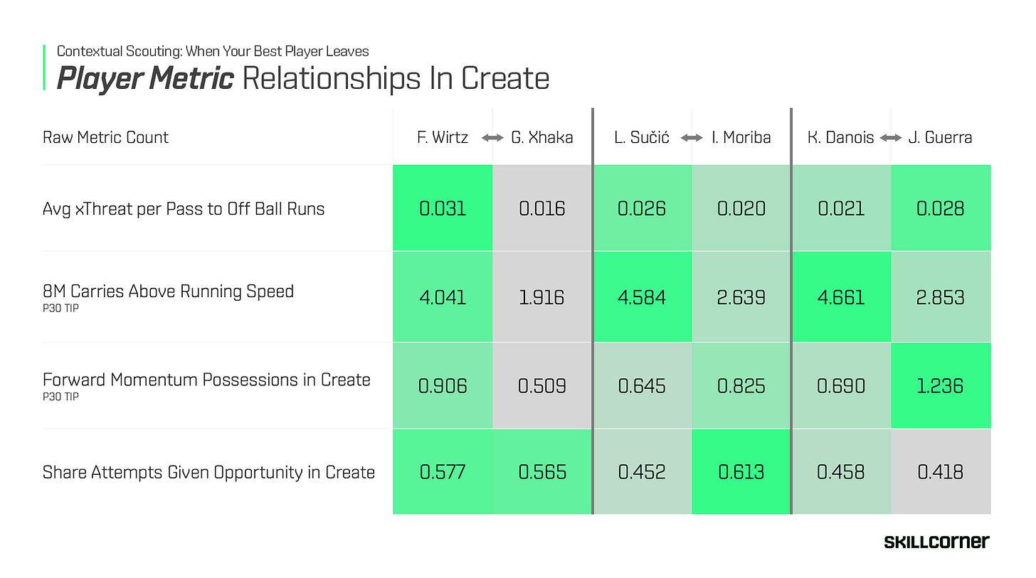 Take Ilaix Moriba and Luka Sučić as an example. Moriba ranks fairly high for Forward Momentum In Create but averages a higher pass attempt percentage to runs ahead of the ball than Wirtz and Paz.