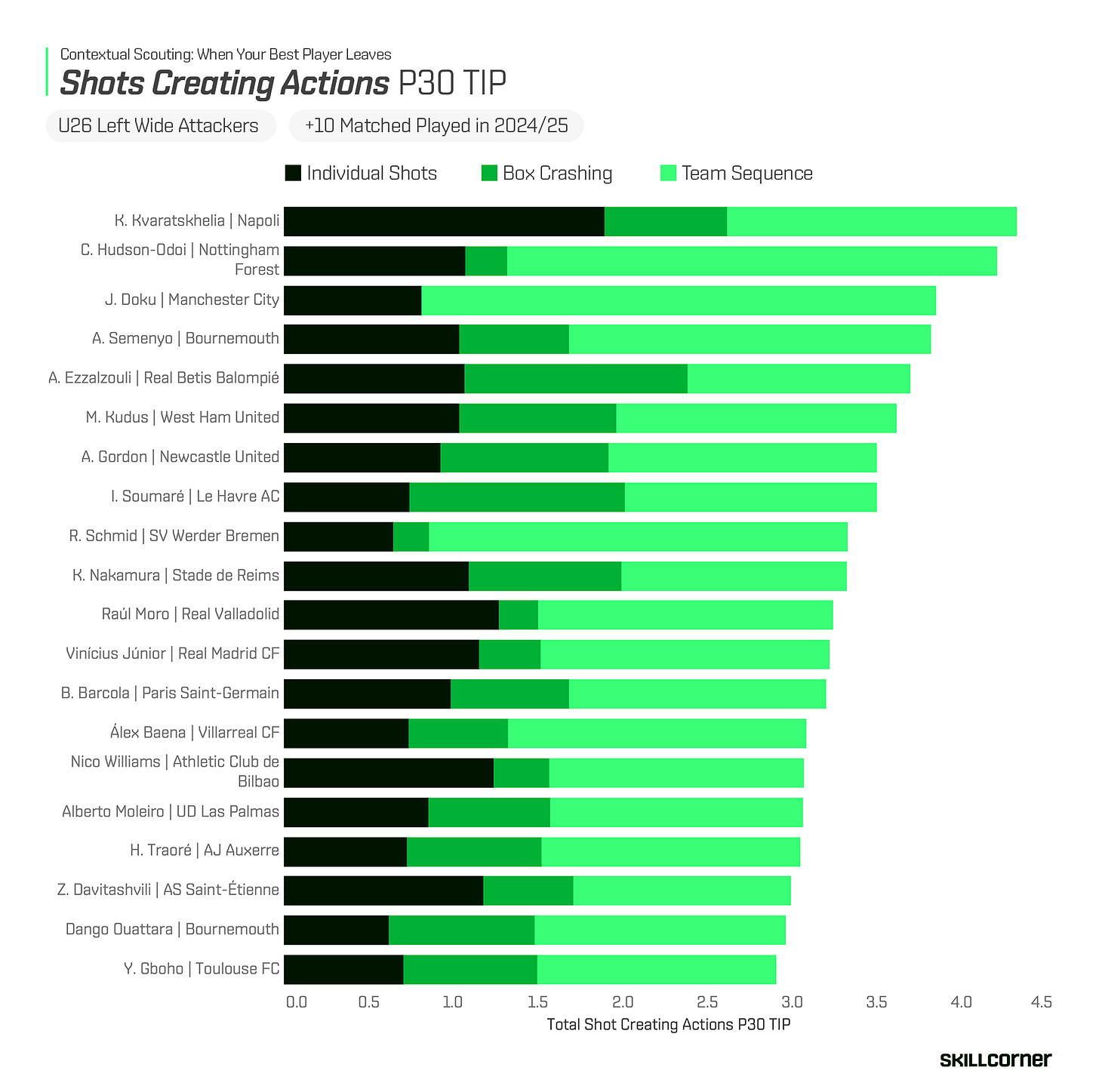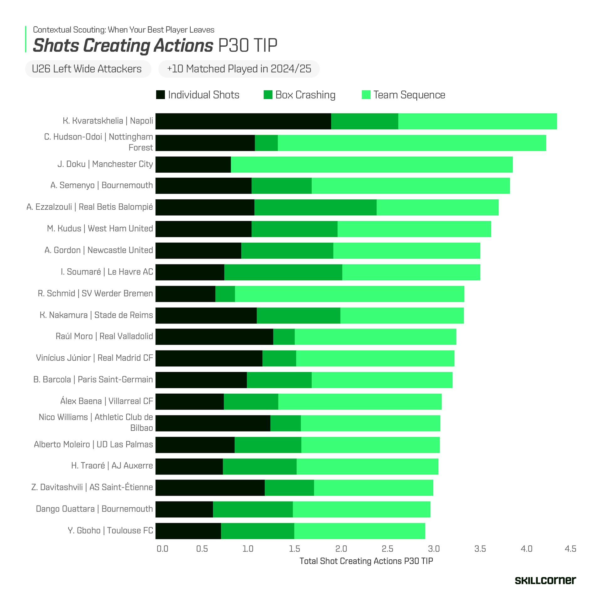 Leading the rankings for Left Wide Attackers, Khvicha Kvaratskhelia stands out with 4.3 shot-creating actions (SCA). His profile is skewed toward individual brilliance, with 44% of his output generated from direct carries followed by his own shots while playing for Napoli.