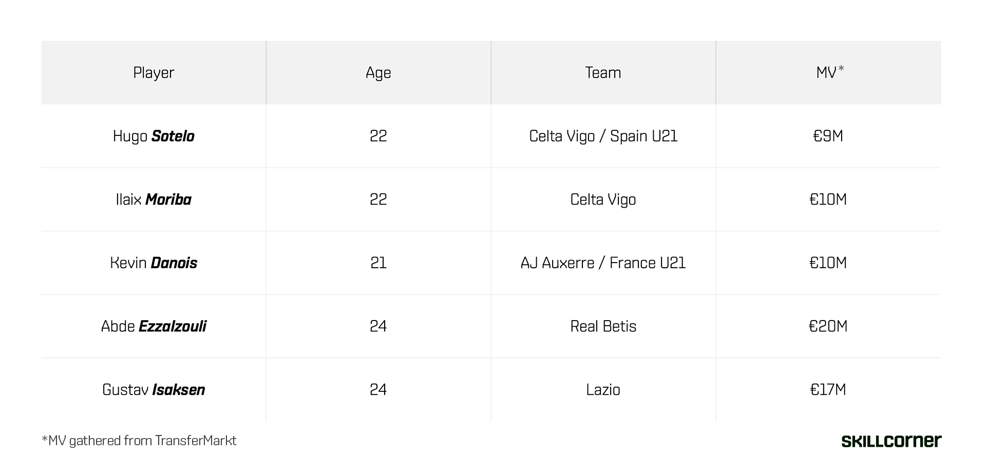 With Hugo Sotelo operating as the No. 6, we secure a stable distributor at the base of midfield. He underpins our progression through an elite volume of forward momentum actions in the Create phase, ranking in the 99th percentile. In addition, he averaged 4.55 pass attempts through the second last line (98th percentile) just in front of Granit Xhaka and Adam Wharton last season. Alongside Sotelo, we have selected Ilaix Moriba, also from Celta Vigo, to add a more aggressive edge in possession. Moriba is willing to take even greater risk with his pass attempts to runs ahead of the ball, and contributing across multiple phases as a dynamic No. 8 profile.