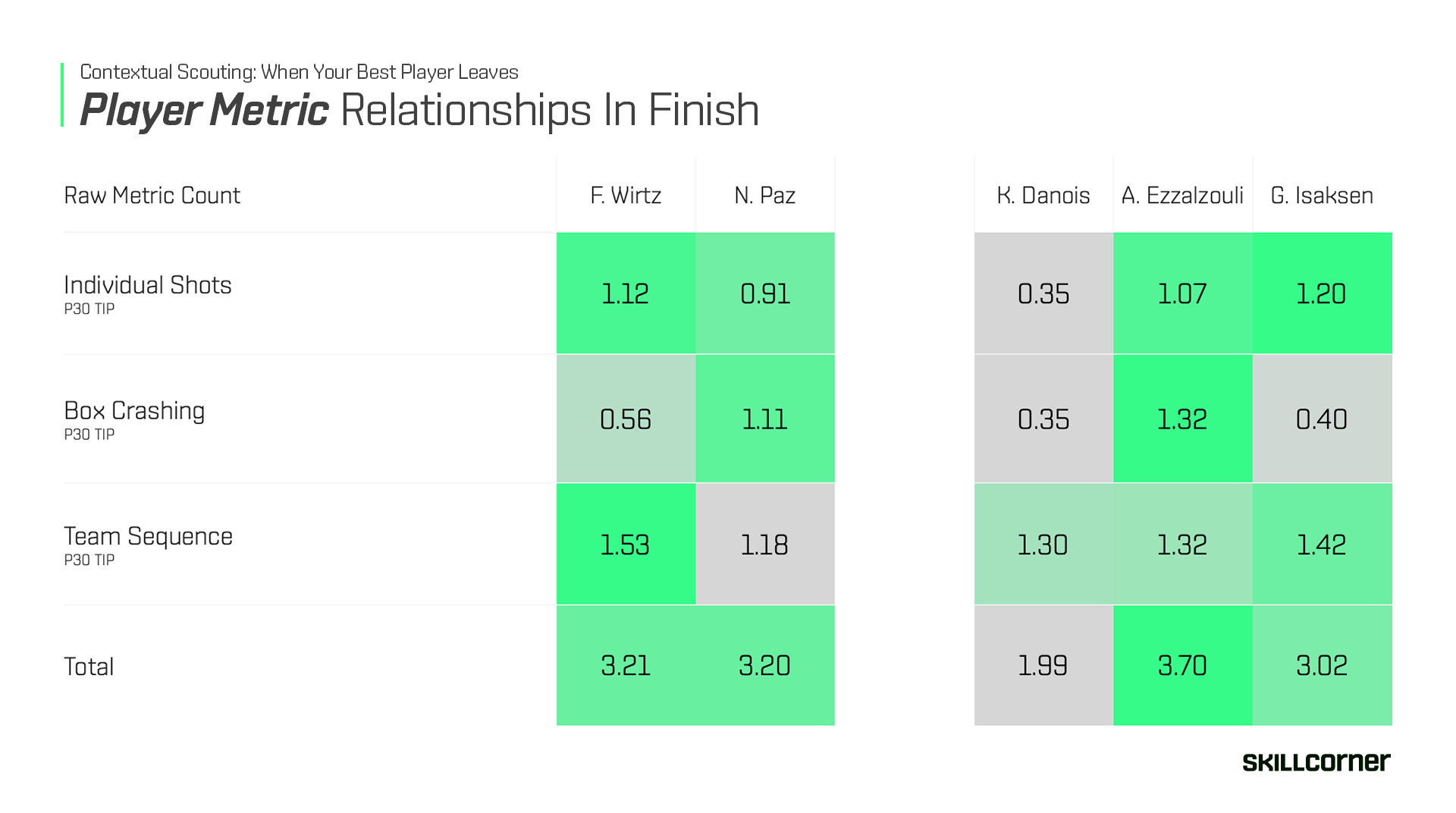 Notably, Ezzalzouli on his own produces a higher average shot creation score than both Wirtz and Paz. That comes with the important context that his contribution is shaped by his role as an attacker, but it further underlines how different profiles and positions can collectively replicate elite creative output.