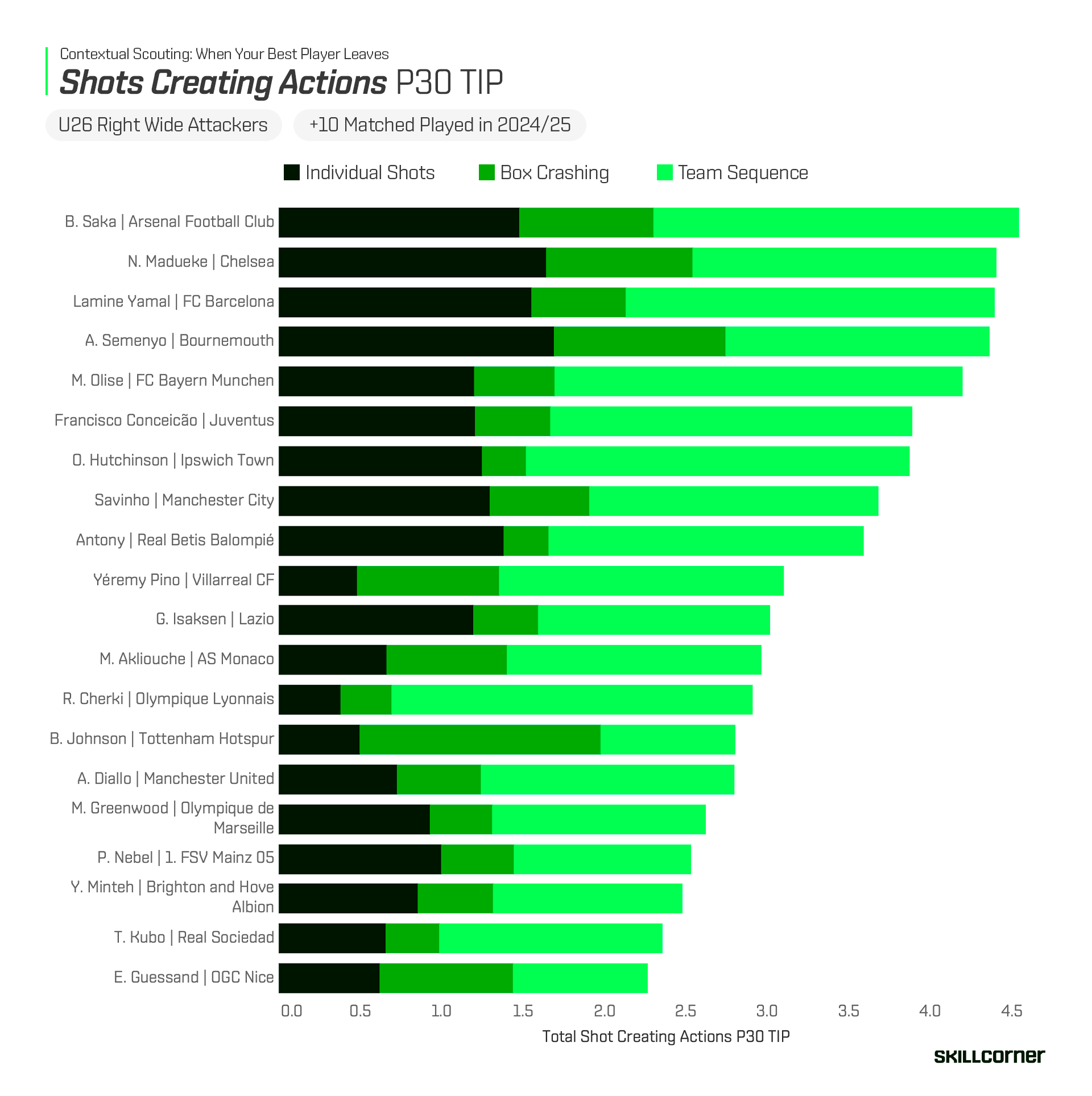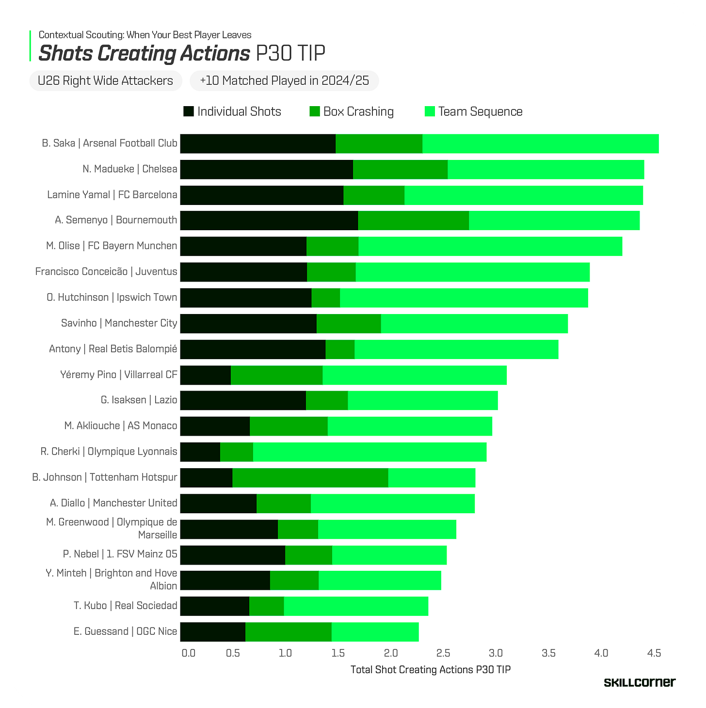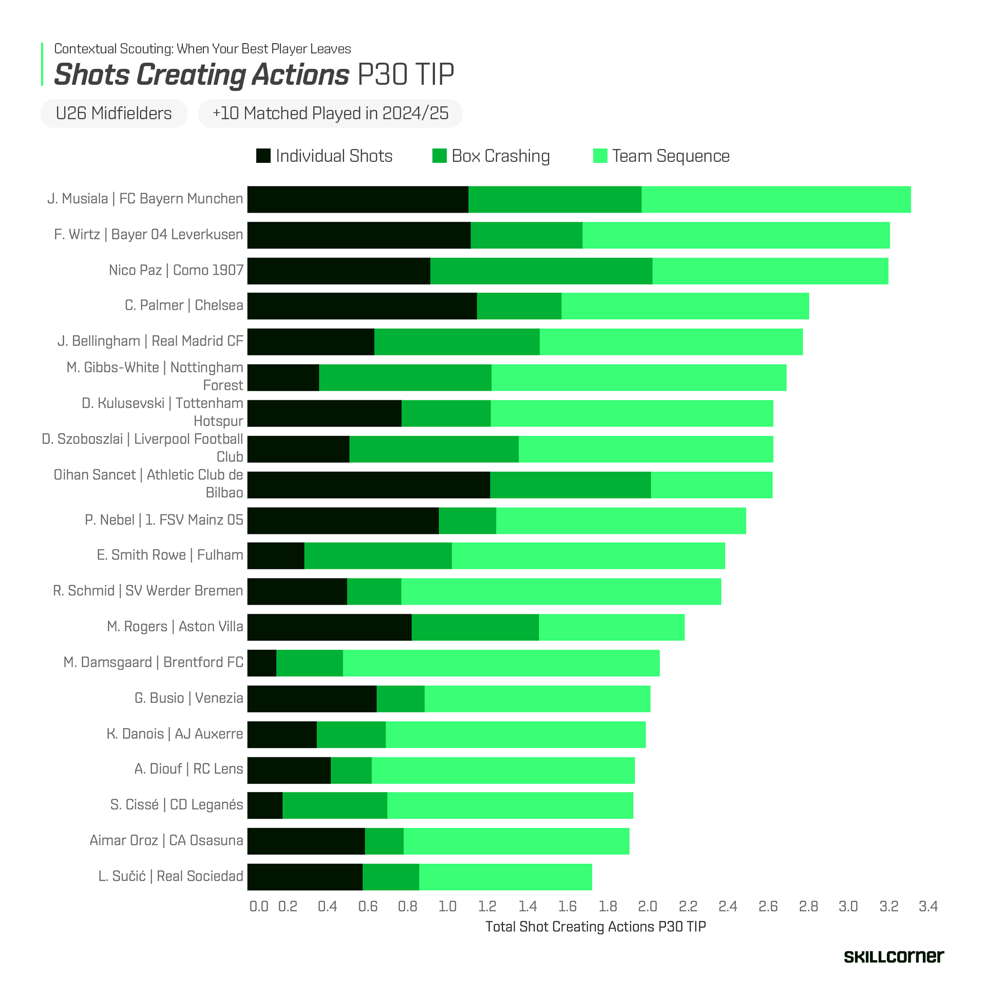 Topping the list is Jamal Musiala, who recorded 3.3 SCA per 30 minutes of Team In Possession (P30 TIP). He is closely followed by Florian Wirtz and Nico Paz, the only other midfielders to average more than 3.0 shot-creating actions.