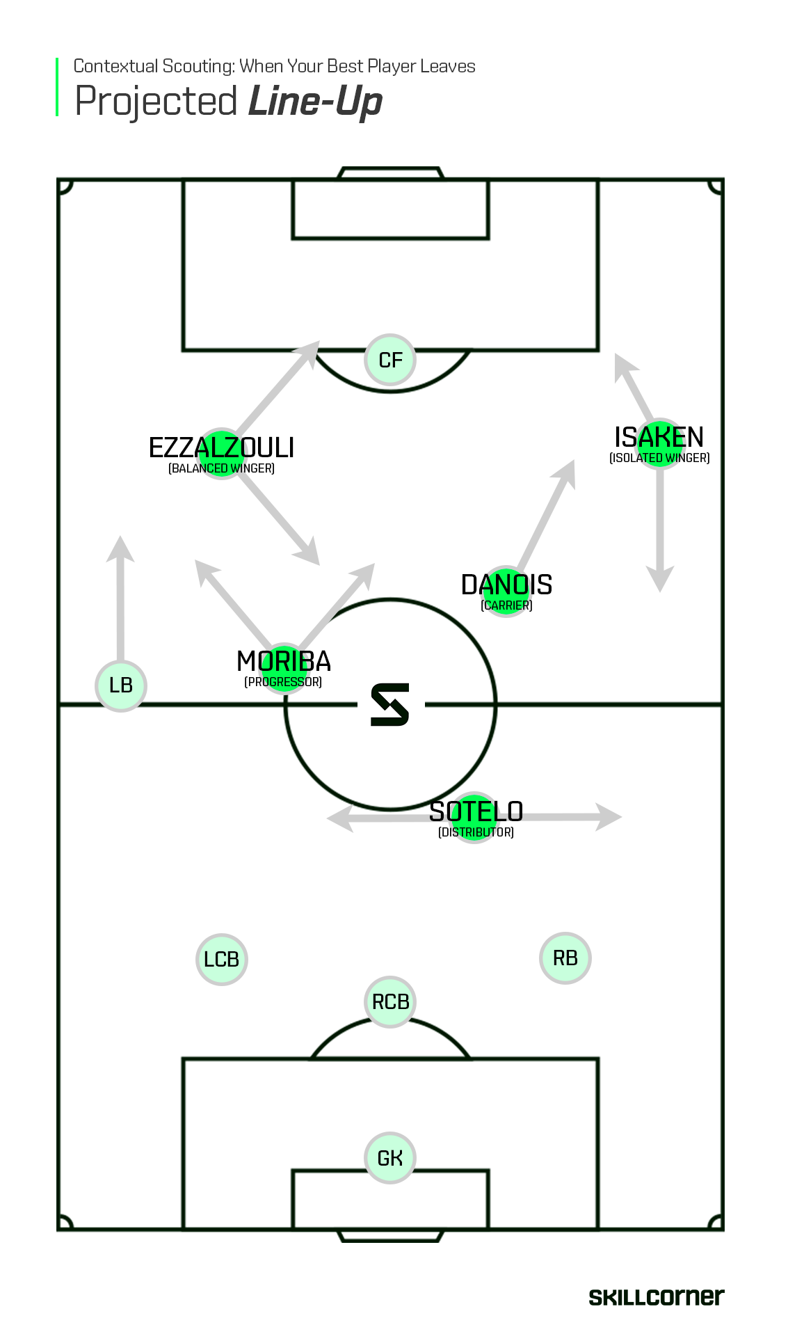 By integrating the analyzed profiles, we can reconstruct the output of a “departing star” through a diversified attack. This not only makes the team less reliant on a single individual but also makes the offensive structure harder for opponents to defend, as threats now emerge from multiple zones and varying action types. Below, we have created a projected line-up with our chosen profiles: